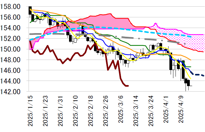 均線や、一目均衡表・転換線145.68 円の切り下がりなど低