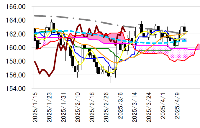均線へ近づくように162.09 円まで下値を探る場面があった。