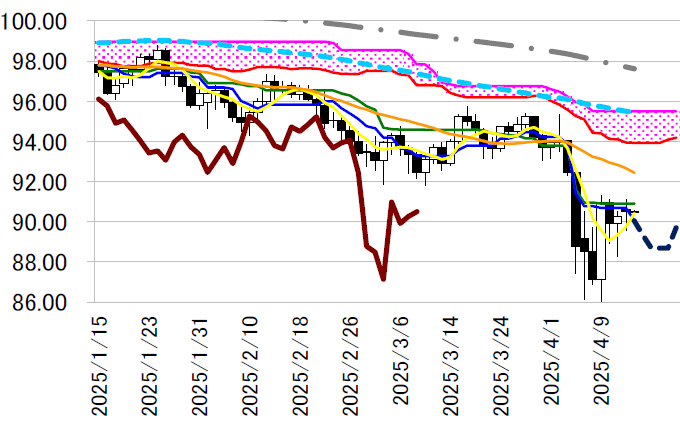 敗し、一目均衡表・転換線90.68 円以下で下値を試す動きに