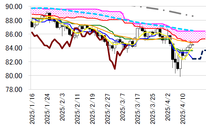 で上昇が進んだ。押し戻されて雲の下限84.84 円を下回って