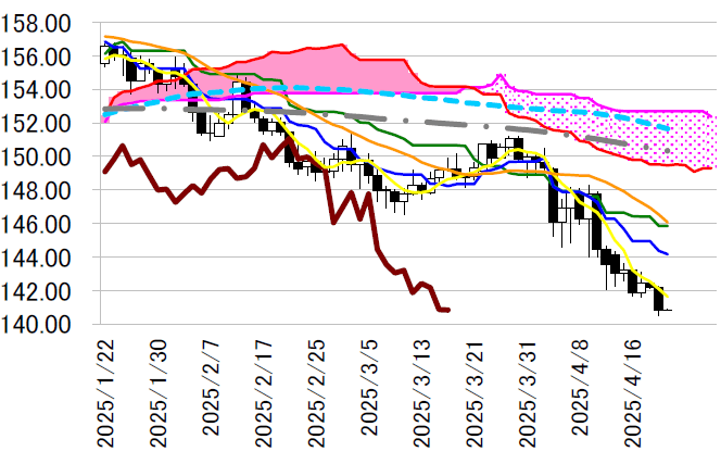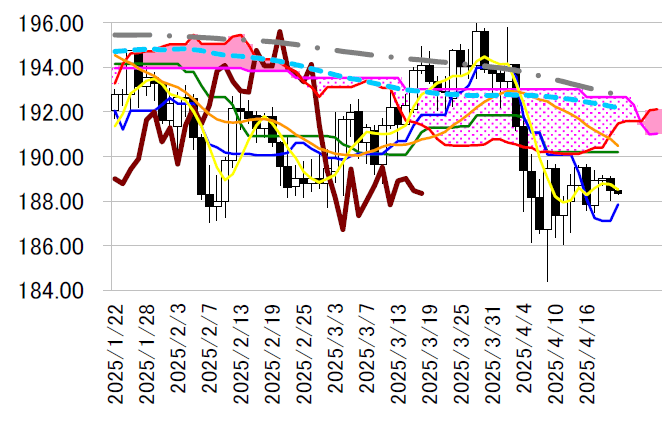 日足一目・転換線は本日187.80 円台まで上昇し、週後半