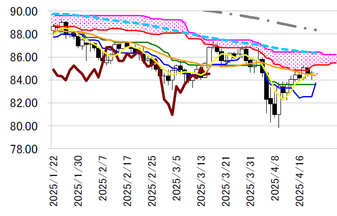 げ止まった。5 日線が位置する84.50 円台まで持ち直して引