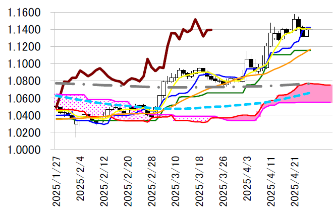 日足一目・転換線は1.1419 ドルと昨日からは横ばいだが、