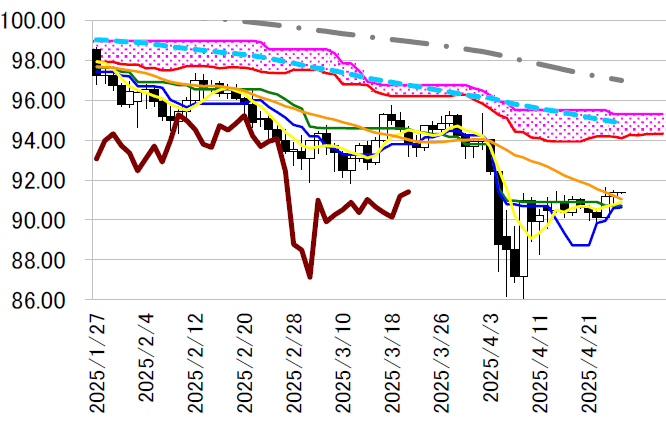 転換線は本日90.60 円台まで水準を上げ、90.72 円の基準
