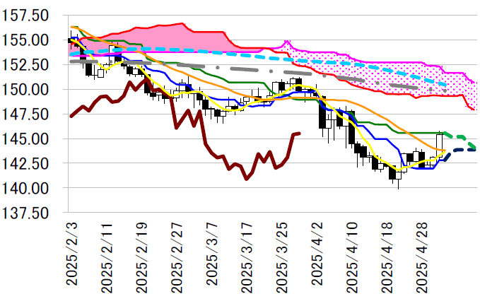 一目・基準線145.55 円を上回る145.73 円まで一時上昇。