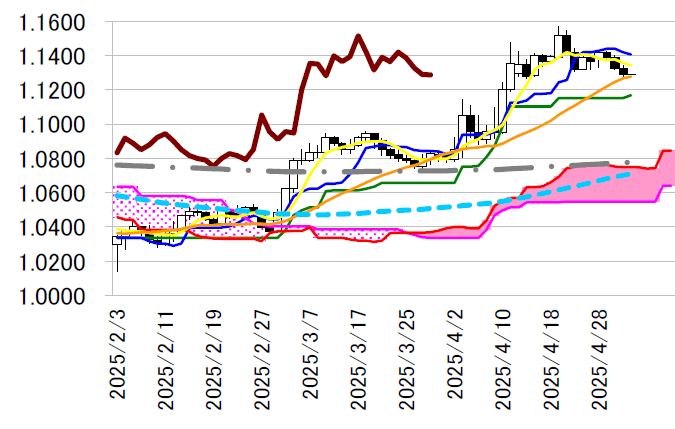 陰線引け。1.14 ドル台で低下中の一目均衡表・転換線の動