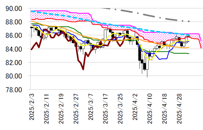 21 日移動平均線が上向くなか、本日は雲の上限86.21 円を