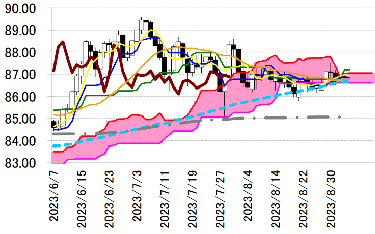 陽線引け。転換線は基準線を下回り、遅行スパンは実線を下回り、雲の上で引けたものの、雲の中へ入りつつあるため、売りシグナルが優勢な展開となっている。しかし、転換線を上回って引けており続伸の可能性が示唆されている。本日は、転換線 86.84 円や雲の上限 87.02 円を念頭に置き、8 月 21 日の安値を支持に押し目買いスタンスで臨み、同水準を下抜けた場合は手仕舞い。