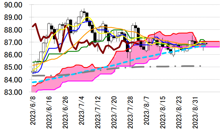 陰線引け。転換線は基準線を下回り、遅行スパンは実線を下回り、雲の中で引けているものの、売りシグナルが優勢な展開となっている。しかし、孕み線で反落したものの転換線を上回って引けており反発の可能性が示唆されている。本日は、転換線 86.84 円を念頭に置き、5 日の安値を支持に押し目買いスタンスで臨み、同水準を下抜けた場合は手仕舞い。