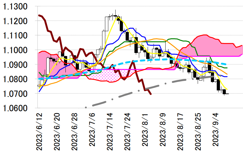 ユーロドルは反落。終値は 1.0696 ドルと前営業日 NY 終値(1.0727 ドル)と比べて 0.0031 ドル程度のユーロ安水準だった。米経済指標の上振れを受けて米金利が上昇するとユーロ売り・ドル買いが先行し、一時 1.0686 ドルと 6 月 7 日以来 3 カ月ぶりの安値を更新した。ただ、米長期金利が低下に転じると買い戻しが優勢となり、1.0710 ドル付近まで下げ渋った。もっとも、ユーロ圏景気の減速懸念からユーロ買いは広がらず、戻りも限定的だった。