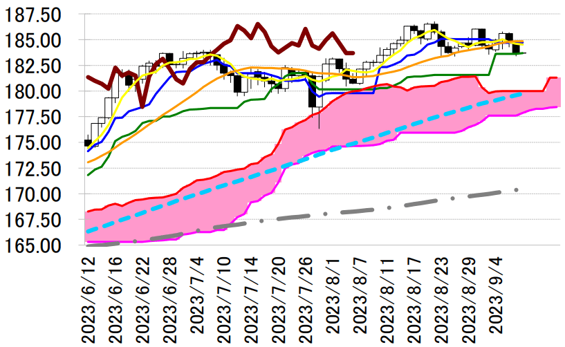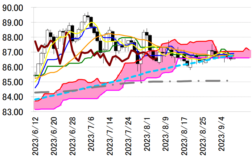 陰線引け。転換線は基準線を上回っているものの、遅行スパンは実線を下回り、雲の下で引けていることで、売りシグナルが優勢な展開となっている。3 手連続陰線で転換線を下回って引けており続落の可能性が示唆されている。 本日は、転換線 86.91 円を念頭に置き、雲の上限を抵抗に戻り売りスタンスで臨み、同線を上抜けた場合は手仕舞い。