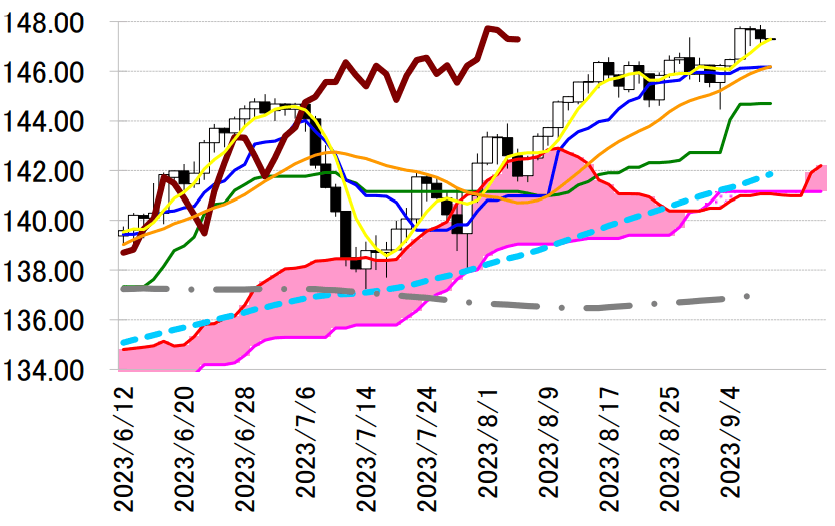 陰線引け。転換線は基準線を下回り、遅行スパンは実線を下回り、雲の下で引けていることで、三役逆転の強い売りシグナルが点灯している。抱き線で反落して転換線を下回って引けており続落の可能性が示唆されている。 本日は、転換線を抵抗に戻り売りスタンスで臨み、同線を上抜けた場合は手仕舞い。