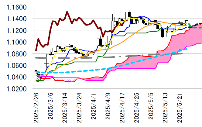 7 日以来の高値1.1375 ドルをつけた。基準線は明日にも低下