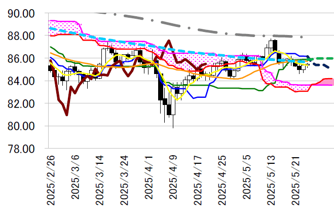 一目・転換線86.15 円が、明日にも基準線を下回る見込み。