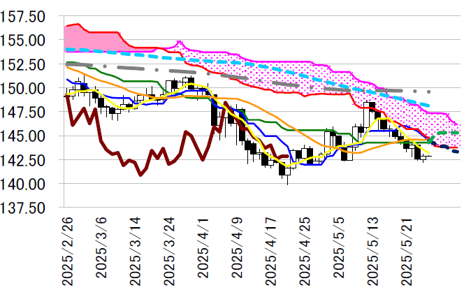 下中の5 日移動平均線を前に頭打ち。その後も143 円付近が