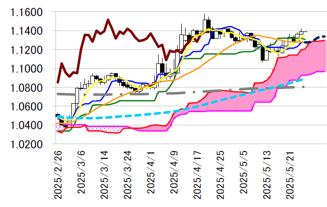 7 日以来の高値1.1375 ドルをつけた。基準線は明日にも低下