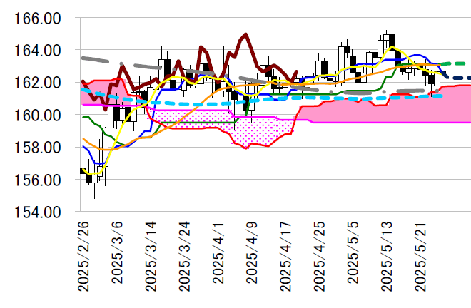は162.58 円へ低下した転換線前後の攻防。ただ、下値に一