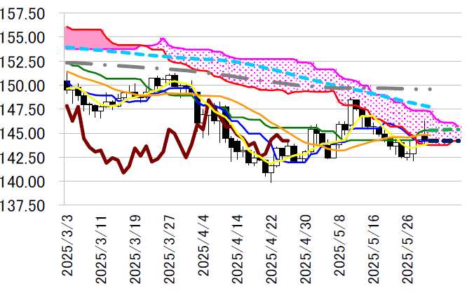 も想定でき、一目・雲の下限143.76 円の下抜けを試す展開も