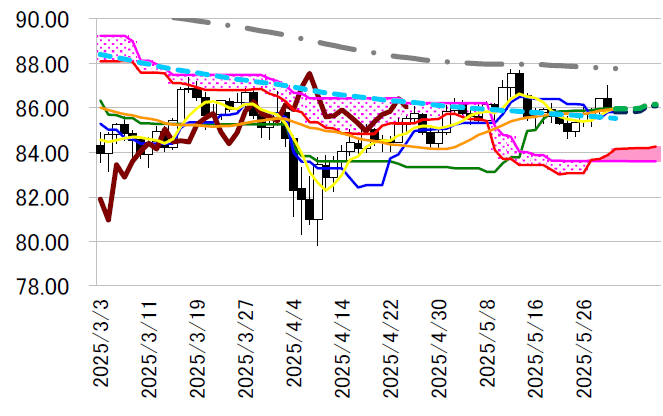表・転換線は現水準85.81 円から今後上昇傾向をたどる公算。