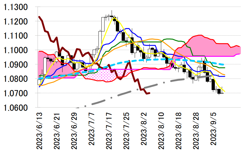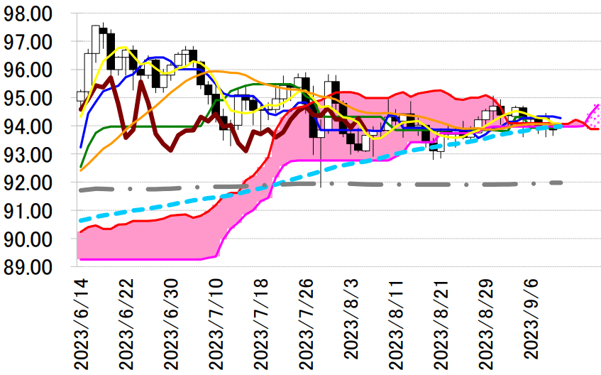 陽線引け。転換線は基準線を上回り、遅行スパンは実線を上回り、雲の上で引けていることで、三役好転の強い買いシグナルが点灯している。しかし、抱き線で反発したものの転換線を下回って引けており反落の可能性が示唆されている。本日は、転換線 94.33 円を念頭に置き、8 月 30 日の高値を抵抗に戻り売りスタンスで臨み、同水準を上抜けた場合は手仕舞い。