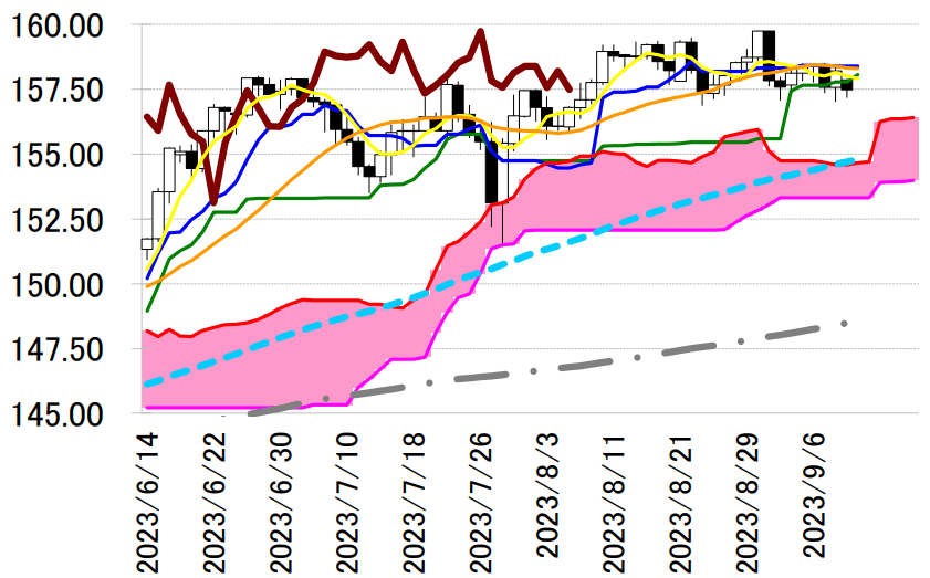 陽線引け。転換線は基準線を上回り、遅行スパンは実線を上回り、雲の上で引けていることで、三役好転の強い買いシグナルが点灯している。孕み線で反発したものの転換線を下回って引けており反落の可能性が示唆されている。本日は、転換線 158.39 円を念頭に置き、8 月 30 日の高値を抵抗に戻り売りスタンスで臨み、同水準を上抜けた場合は手仕舞い。