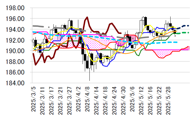 陰線引け。一目均衡表・転換線194.11 円付近の動きから、
