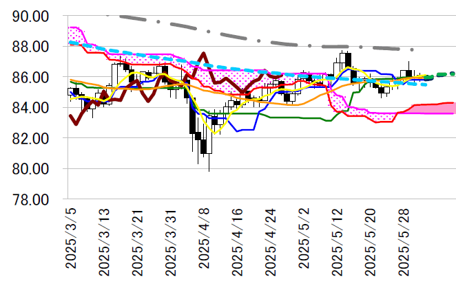 85.81 円、基準線85.97 円前後のレンジを維持している。上