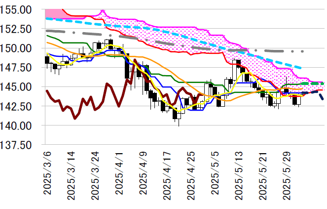 目均衡表・雲の下限や、上昇余地を残す一目・転換線144.20