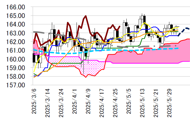 反発している。一目均衡表・基準線163.15 円を下抜ける場