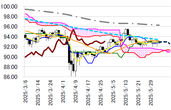 92.76 円から、明日には92.95 円へ切り上がる一目均衡表・