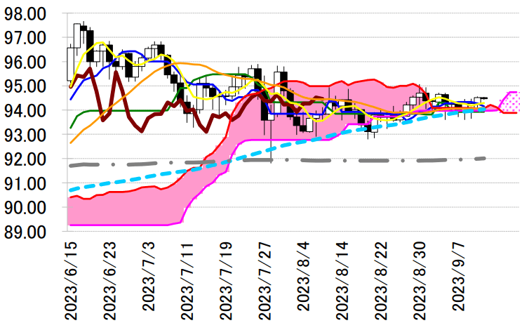 陽線引け。転換線は基準線を上回り、遅行スパンは実線を下回り、雲の上で引けていることで、三役好転の強い買いシグナルが点灯している。3 手連続陽線で転換線を上回って引けており続伸の可能性が示唆されている。本日は、転換線 94.16 円を念頭に置き、雲の下限を支持に押し目買いスタンスで臨み、同線を下抜けた場合は手仕舞い。