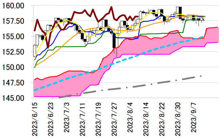 陽線引け。転換線は基準線を下回り、遅行スパンは実線を下回り、雲の下で引けていることで、三役逆転の強い売りシグナルが点灯している。3 手連続陽線で反発したものの、依然として転換線を下回って引けており反落の可能性が示唆されている。本日は、転換線を抵抗に戻り売りスタンスで臨み、同線を上抜けた場合は手仕舞い。