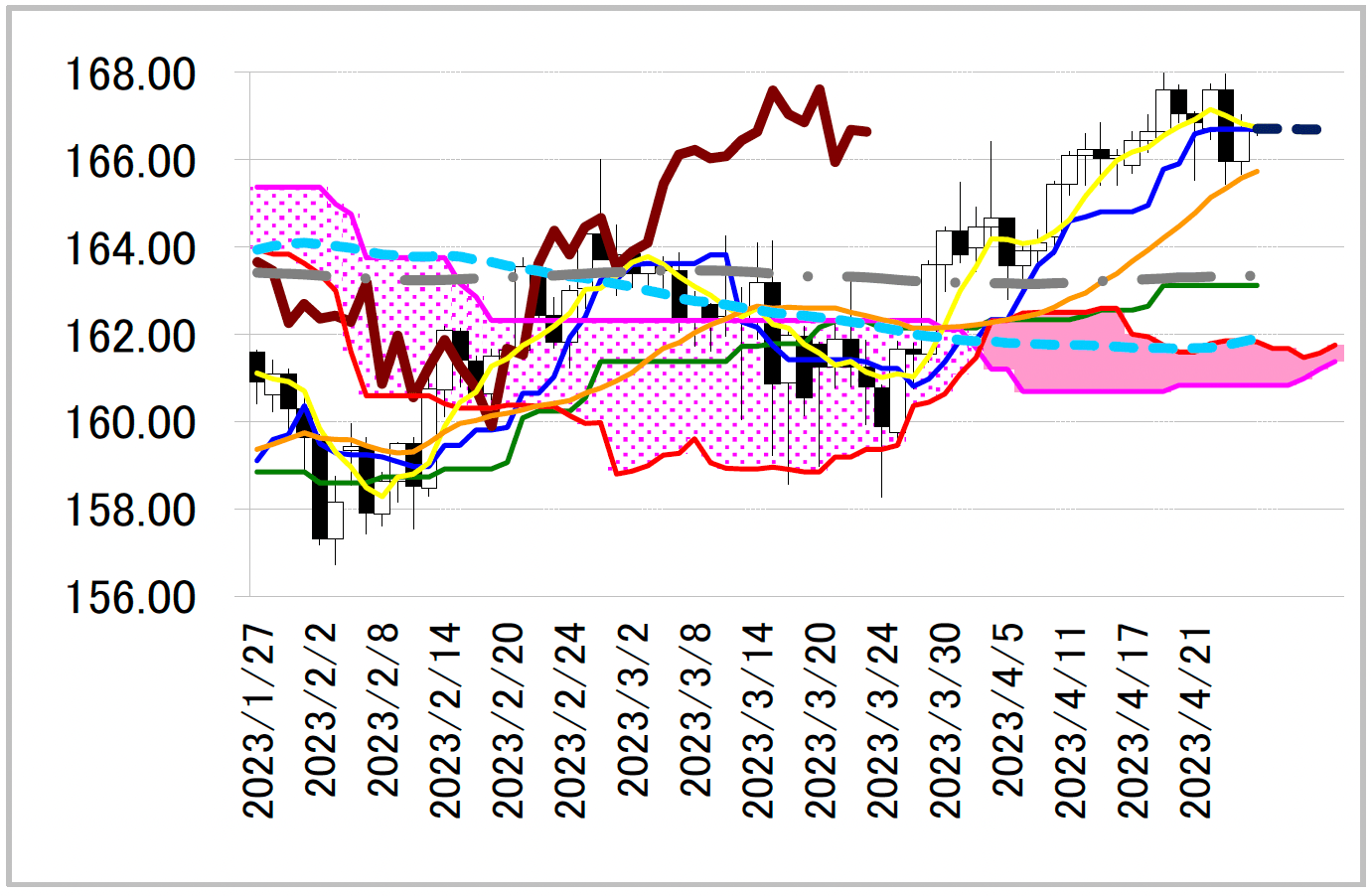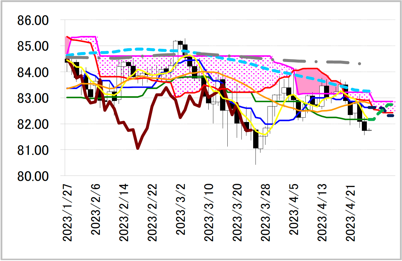 陰線引け。一目均衡表・基準線82.63円付近が重く、3月28日以来の安値81.56 円まで下落した。基準線付近の重さが気になるものの、同線は週明けには切り上がり始める可能性がある。同線に沿って一目・雲の下限を試す展開を期待したいところ。ただ、その付近では低下する転換線も抵抗になるため、上値が重くなりそうだ。