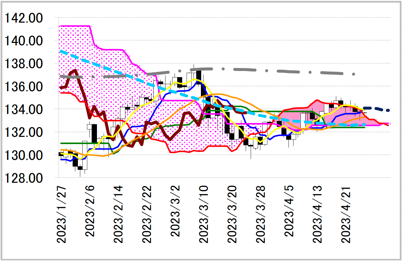 下影小陰線引け。133.65 円で推移していた一目均衡表・転