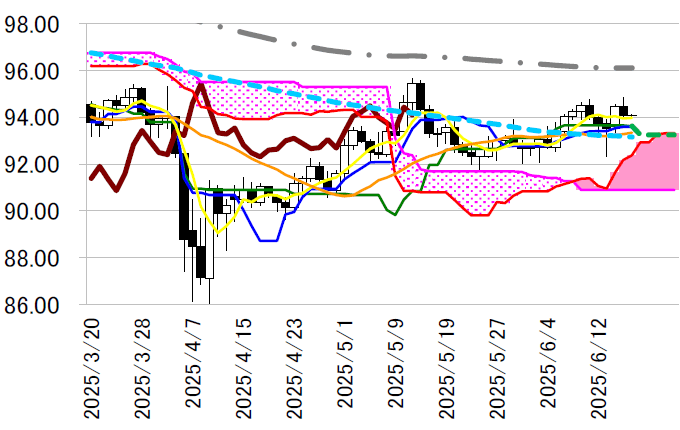 ものの失速した。本日93.61 円へ小幅に低下した一目均衡