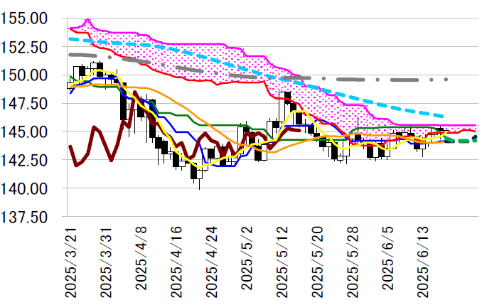 本日の東京外国為替市場のドル円は、中東情勢緊迫化を受けた有事のドル買いや原油価格上昇を受けた 円売りで、上値抵抗水準となっている日足一目均衡表・雲の上限145.55円の突破を視野に入れた展開が 予想される。