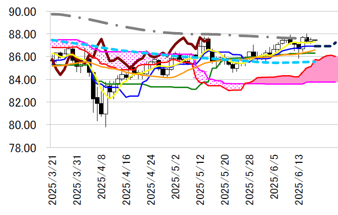 表・転換線は頭打ちを回避。同線は現水準86.92 円での横ば