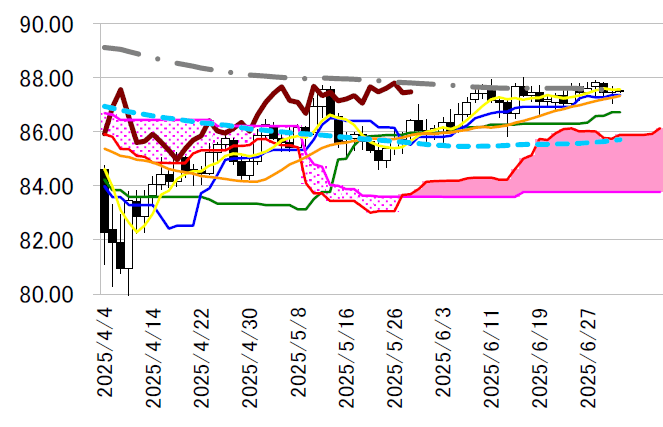 も、87 円手前で下げ止まった。同線の上まで持ち直し、小幅