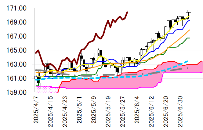 展開に。6 月30 日高値を上抜けると170 円台乗せに成功した。