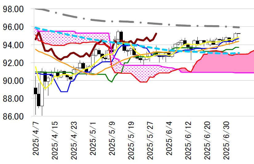 るかに注目。超えると95.90 円台の200 日線が視野に入る。
