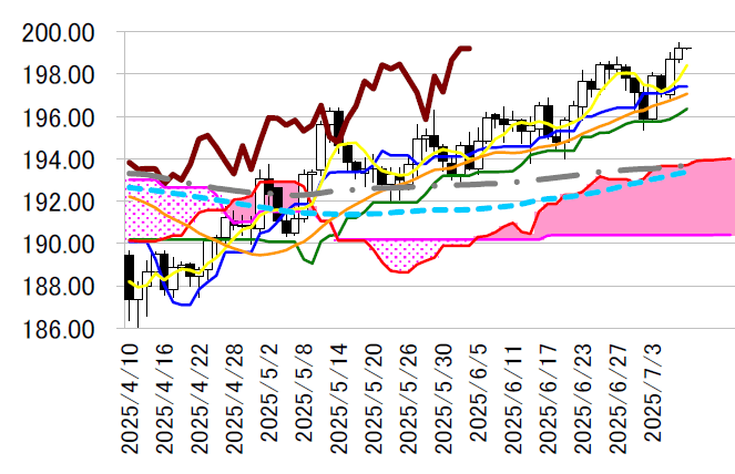一目均衡表では三役好転が点灯するほか、引値でも199 円
