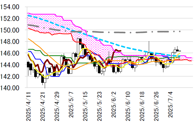 本日の東京外国為替市場のドル円は、米10年債利回りの低下を受けて上値が重い展開が予想される。 ドル円は、トランプ相互関税の8月1日からの適用、そしてそれまでの交渉余地が発表されたことで、 147.18円まで上昇していたものの、伸び悩む展開となっている。5月12日に、ドル円は米中通商協定の 合意報道を受けて148.65円まで上昇した後に失速した。6月23日に、ドル円は米軍によるイラン核施設 への空爆を受けた有事のドル買いで148.03円まで上昇した後にも失速した。