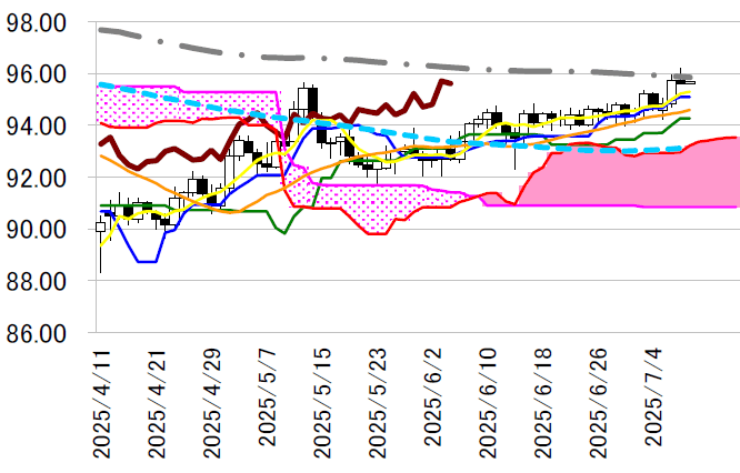 日線や、95 円台まで上昇してきた日足・一目均衡表の転換線
