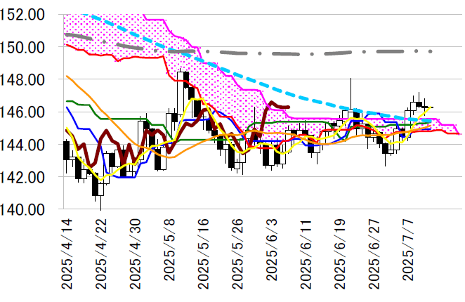 か。上値は節目の147 円、下値は前述の雲上限145.55 円の