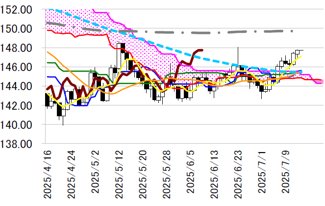 最近、トランプ米大統領の高関税賦課表明にその貿易相手国の通貨売り・ドル買いの反応を示しており、 ドル円は引き続き底堅い動きが見込まれる。関税の影響で日銀の追加利上げの不確実性が高まっているこ とや、20日の参議選で与党の過半数割れが警戒されていることが円に売り圧力として働いており、ドル 円は上方向に傾きやすい地合いとなっている。