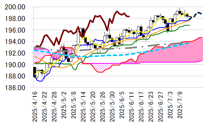 転換線は今週末にも199 円を目前に頭打ちとなる公算。反発