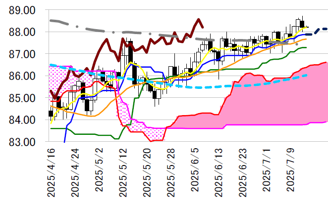 昇余地を残す一目均衡表・転換線87.88 円や、87.66 円前後