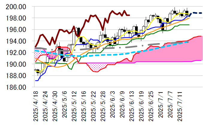 転換線は明日198.90 円へ切り上がったところで頭打ちとな