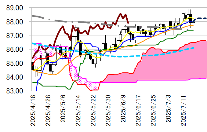 目均衡表・転換線87.98 円付近の攻防が予想される。同線の