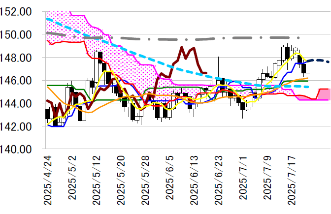 る。146.19 円前後で推移する21 日移動平均線や、一目・基